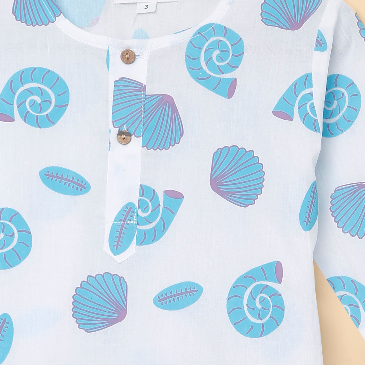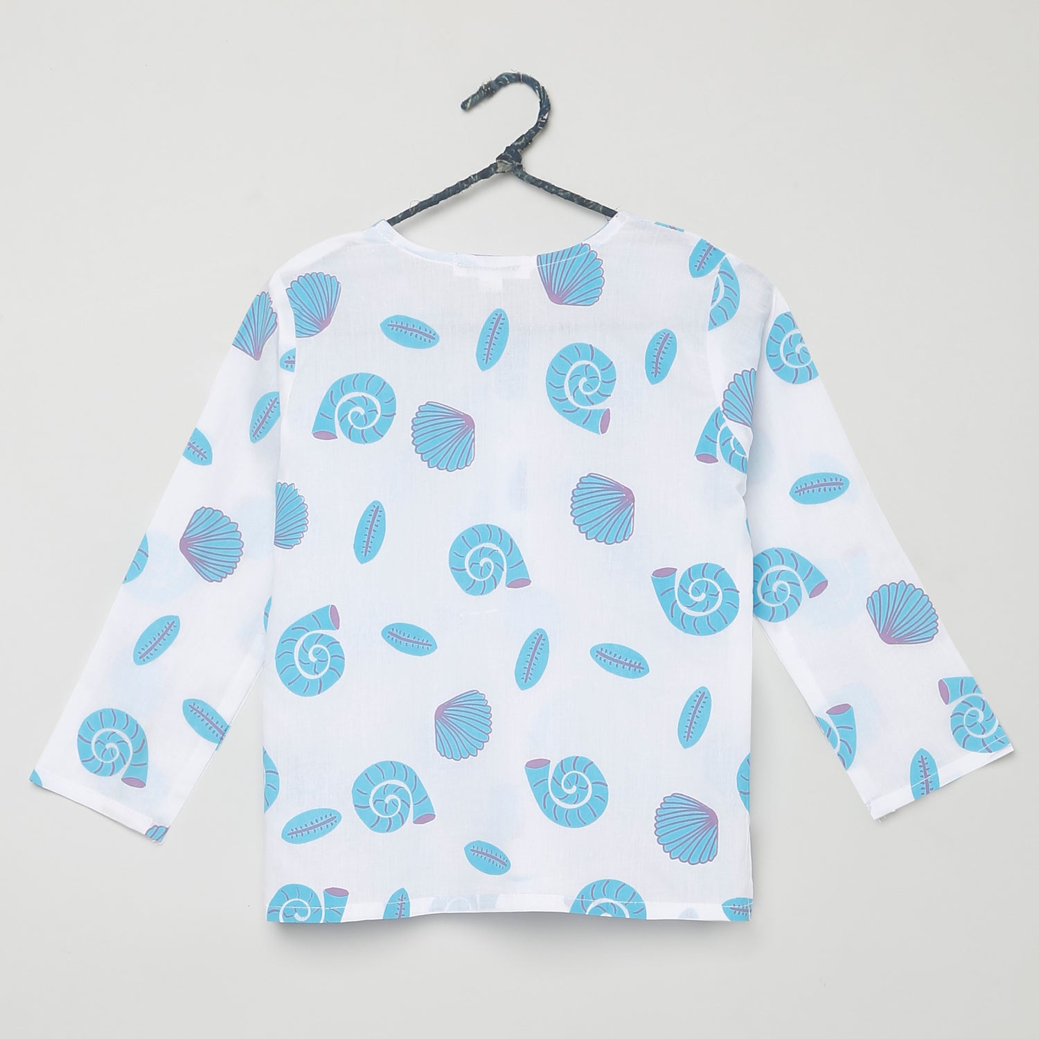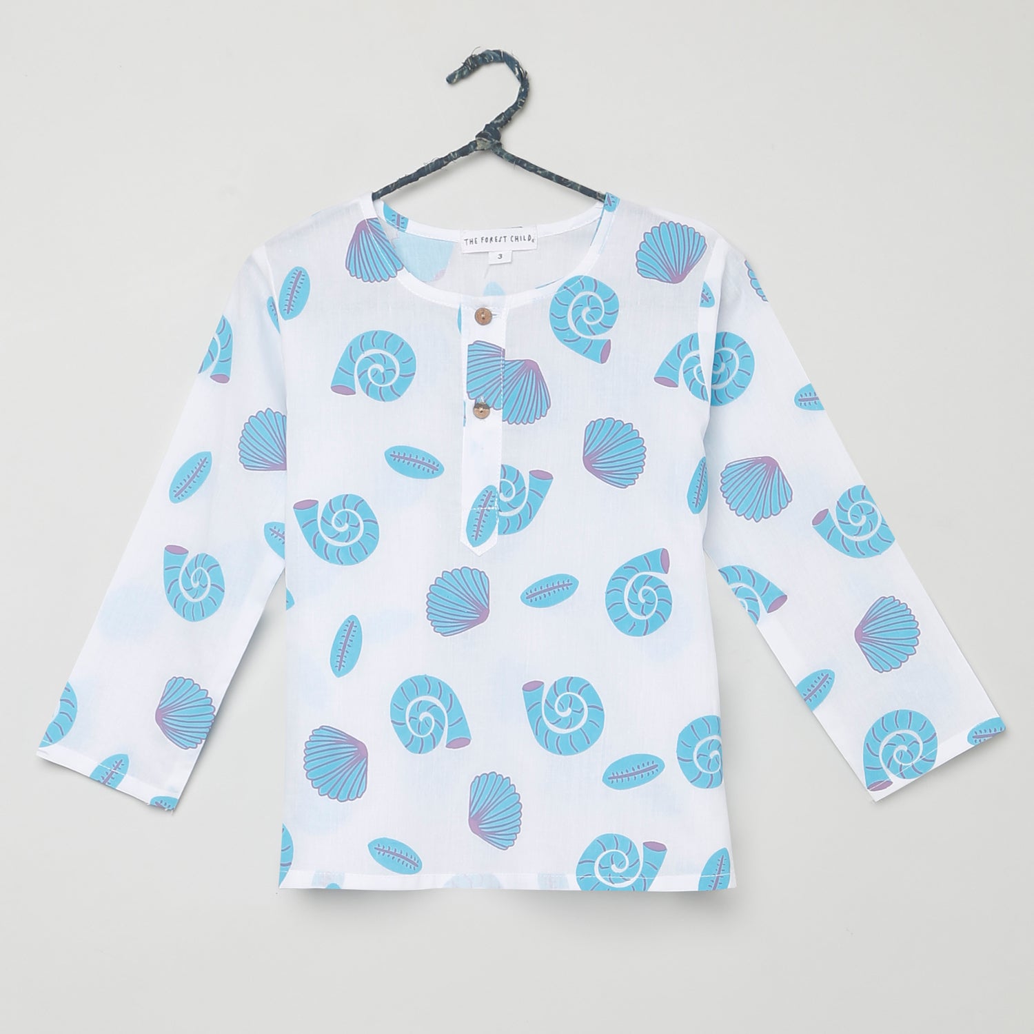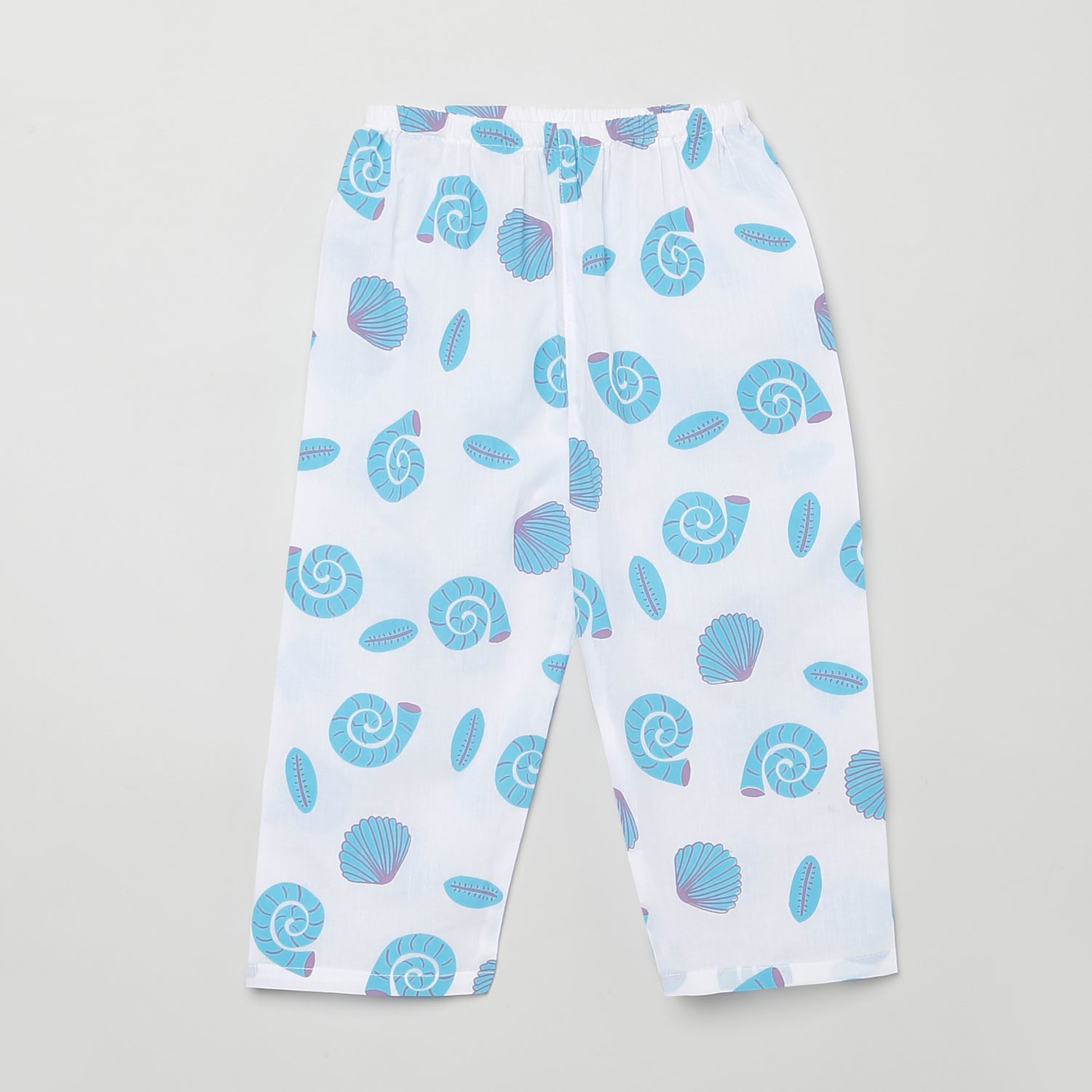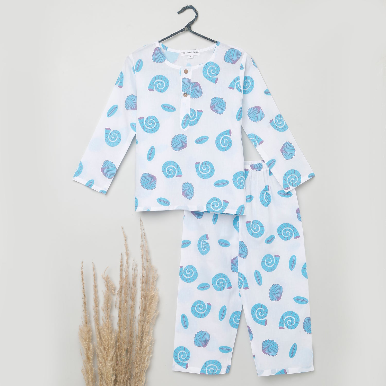 Shell print cotton pyjama set for toddlers & kids in Mauritius. Gender-neutral, soft sleepwear for ages 1-6